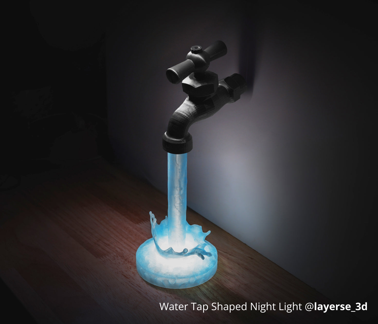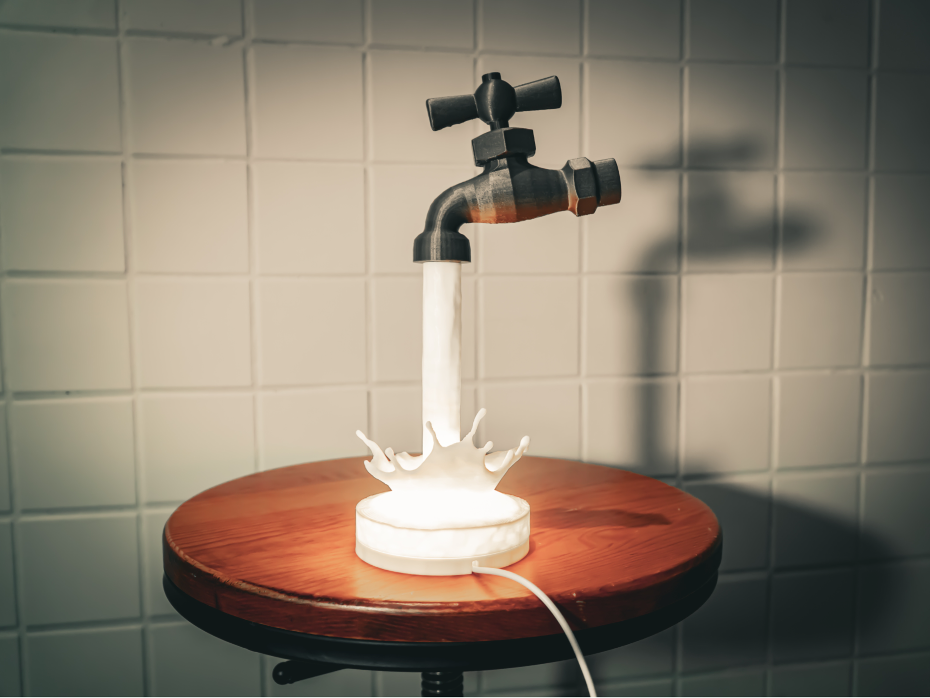 Faucet of Light to nietypowa lampka, która imituje kran unoszący się w powietrzu z „płynącym” strumieniem wody. W rzeczywistości przezroczysty element w kształcie wody wydrukowany z PLA Translucent pełni rolę przewodnika światła LED, tworząc efekt mieniącej się kolumny. Projekt składa się z kilku części łatwych w montażu, a dzięki pinom ustalającym elementy pasują idealnie. Po włączeniu lampka rozświetla się, dając wrażenie prawdziwego przepływu świetlnej „wody” – idealny gadżet do biura, sypialni lub jako designerski element wnętrza.